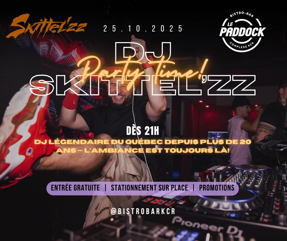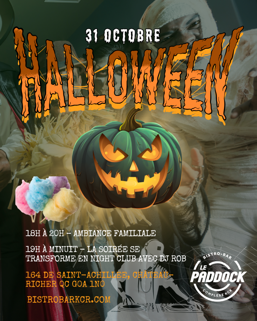 🎃 Soirée Halloween GRATUITE au Paddock! 🎃🪓 Jeux de hache, 🎲 jeux ludiques, 🍬 bonbons, déco terrifiante et ambiance de folie!🕕 18h à 20h – Ambiance familiale🕖 19h à minuit – La soirée se transforme en night club avec DJ ROB💀 Boisson spéciale Bloody Pur Sang : 9$🍹 Promos shooters : 5/10$ ou 10/25$🥤 Promo 26 oz à : 59$🏆 Concours du top 3 costumes – Des prix surprises à gagner!⚡ Entrée GRATUITE – Viens t’amuser et vivre un Halloween inoubliable!📍 Adresse : 164 Rte de Saint-Achillée, Château-Richer, QC G0A 1N0